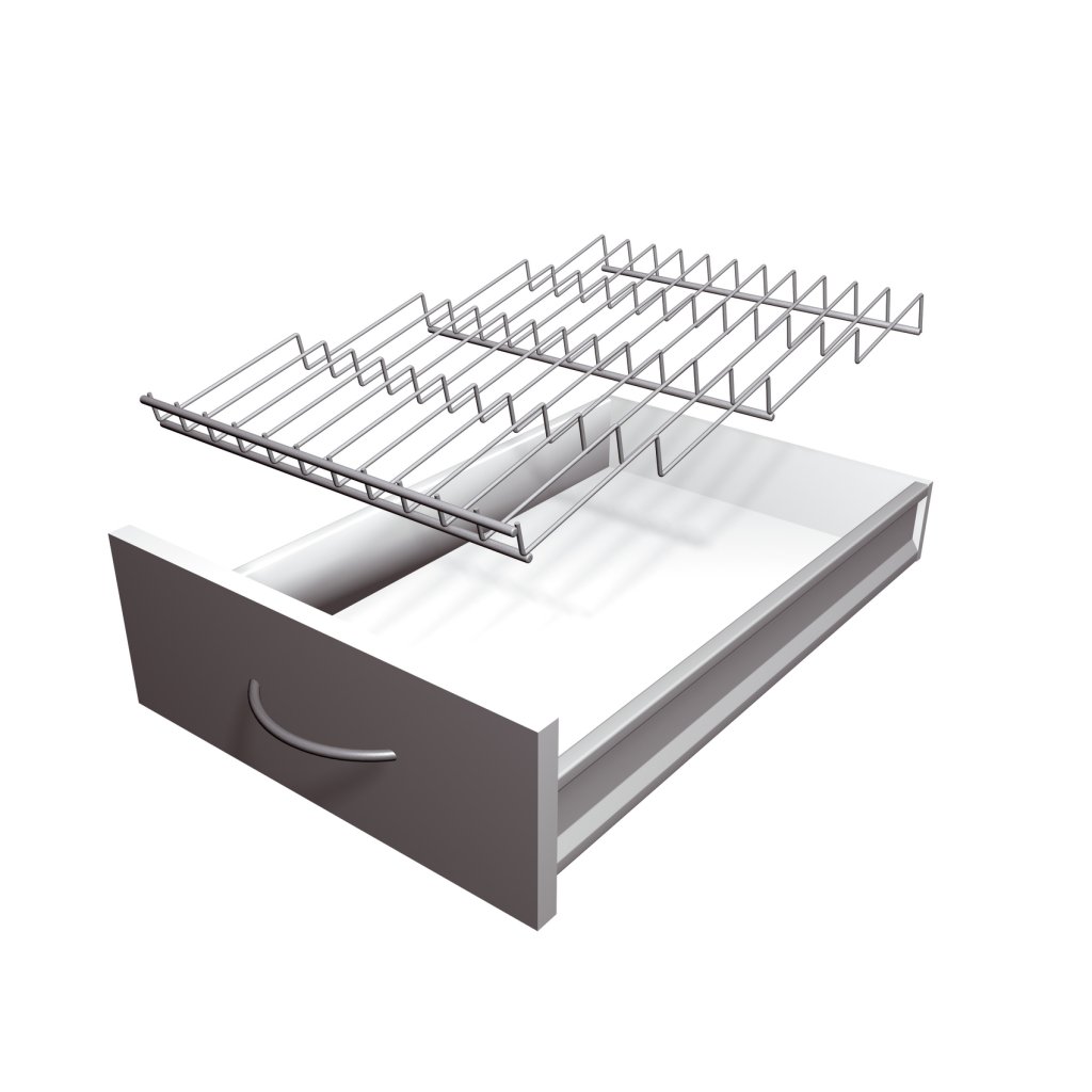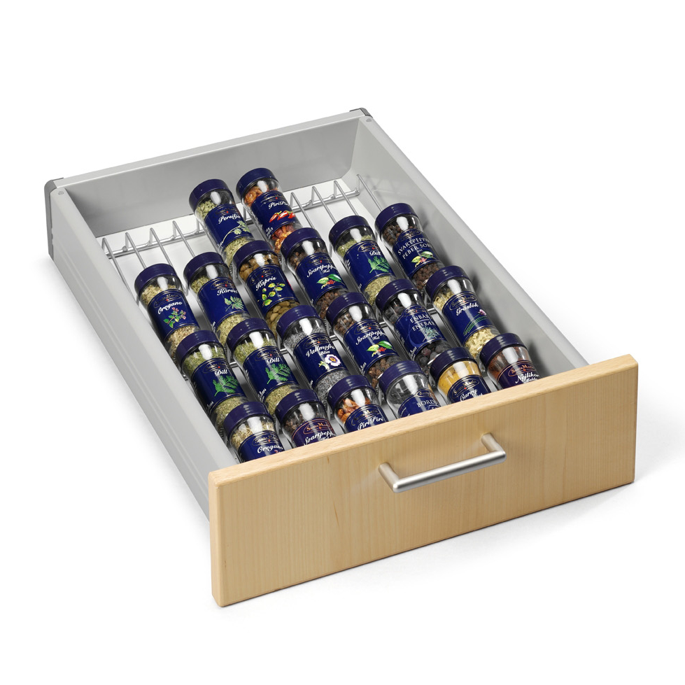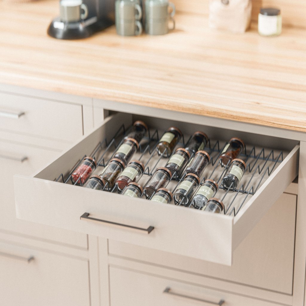 For dig, der ønsker at have krydderierne i en køkkenskuffe, findes denne smarte krydderiindsats, som passer til de fleste køkkenskuffer på markedet. Krydderiindsatsen giver fire skrå plan, hvor du kan opbevare krydderierne.